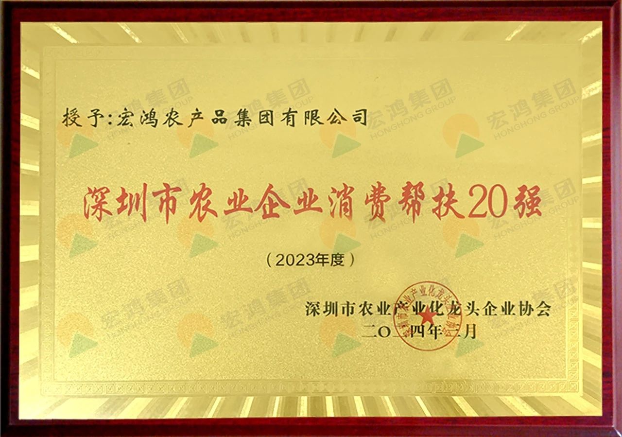 会上,宏鸿以去年稳步发展的综合实力以及“乡村振兴”战略的积极实践,被授予“深圳市农业企业消费帮扶20强”荣誉。
